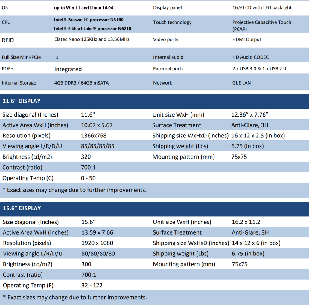 11.6” and 15.6” sizes with thin and attractive aluminum frames.