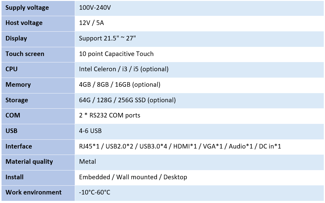 This Panel PC features a sturdy design with industrial-grade protection against water, oil, and dust, making it ideal for demanding environments like restaurants, supermarkets, and industrial control settings. Its embedded, fanless design ensures silent operation and efficient heat dissipation, supporting 24-hour operation across a wide temperature range (-10°C to 60°C). The large 21.5-27 inch 1080p screen provides a clear and reliable display platform, suitable for applications such as intelligent healthcare, CNC lathe, industrial control, restaurant, supermarket and self-service machines. With easy installation options—embedded, wall-mounted or desktop—and strong compatibility through multiple interfaces, this integrated machine adapts seamlessly to various scenarios.