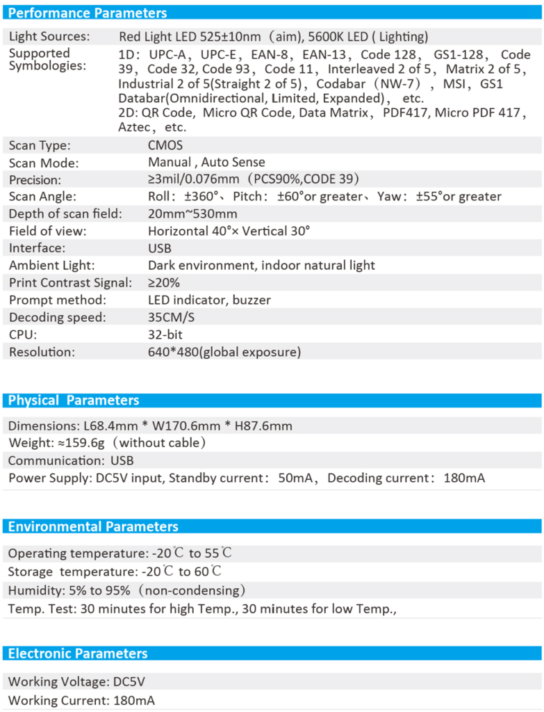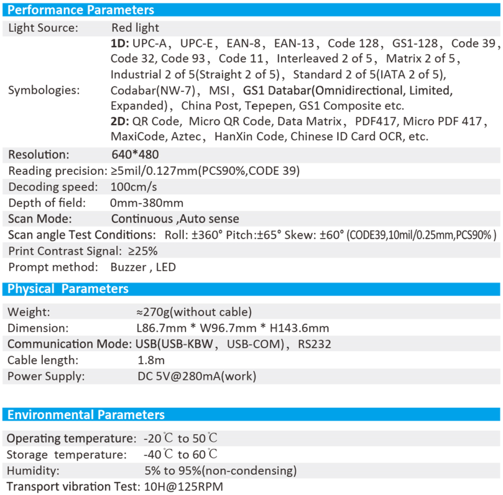 Scanner FeaturesErgonomic design, comfortable using.Read all mainstream1D&2D barcodes in the market easily.High-performance processor, fast decoding. (3mil)Support multiple languages and systems.Widely used in supermarket, warehouse, mobile payment, chain stores. 2D Barcode Scanner GS5220 FeaturesErgonomic design, comfortable using.Read all mainstream 1D 2D barcodes in the market easily.High-performance processor, fast decoding. (5mil)Support multiple languages and systems.Interface: USBWidely used in supermarket, warehouse, mobile payment, chain stores. 2D Desktop Barcode Scanner GS8210