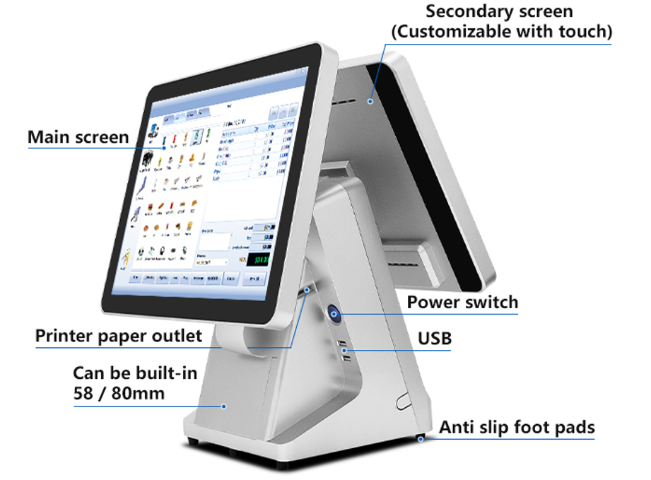 Tower POS, as her name is strength as tower. The stable triangle provides not a feeling of robust and duable but also ensures the high stable touch feeling for no matter front or 2nd touch. The built-in reliable therma printer makes the counter saving space and more in order, easy access design making paper change isn’t challenge anymore. Rich I/O port and attachment design, plus different screen size options in front and back, smart to fulfill either Windows or Android operating system requests.